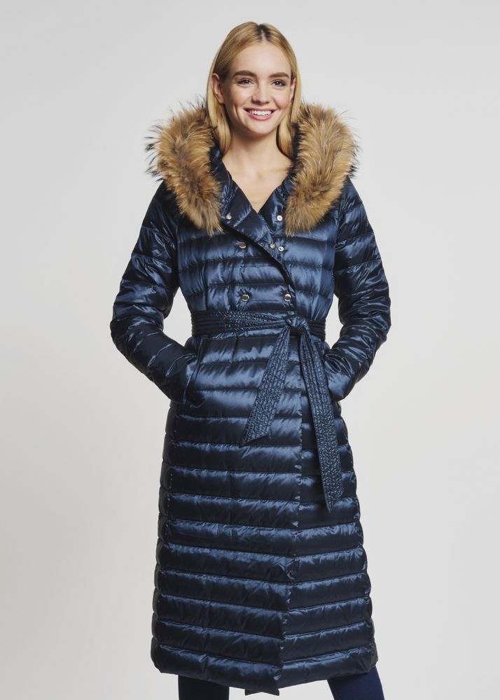 kurtki z dużą ilością zdobień i dodatkowych akcentów w górnej części – np. różnego rodzaju pagony, lekkie uniesienie rękawów w ramionach czy kaptur obszyty futrem. Takie elementy przyciągną uwagę do góry sylwetki, nieco osłabiając skupienie na szerszych biodrach.