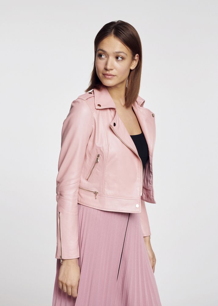6. Delikatność, kobiecość, styl – różowa kurtka skórzana