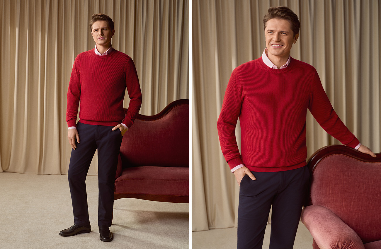 Przejrzyj modele zakładane przez głowę – mogą to być zarówno golfy, jak i fasony z dekoltem w serek. Nie wszyscy panowie lubią wersje rozpinane, więc jeśli Twój partner jeszcze nie ma takiego swetra w swojej szafie, nie warto ryzykować. Jeśli chodzi o kolorystykę, to polecamy czerń, granat, beż oraz szarość, czyli najbardziej bazowe, neutralne barwy. Nie dość, że pasują każdemu, to jeszcze łatwo połączyć je z innymi elementami stylizacji.