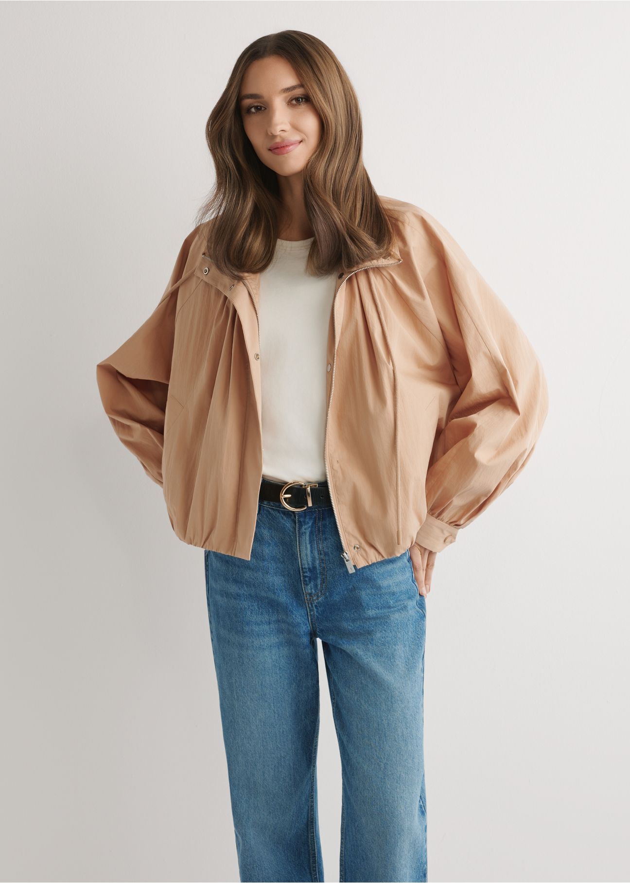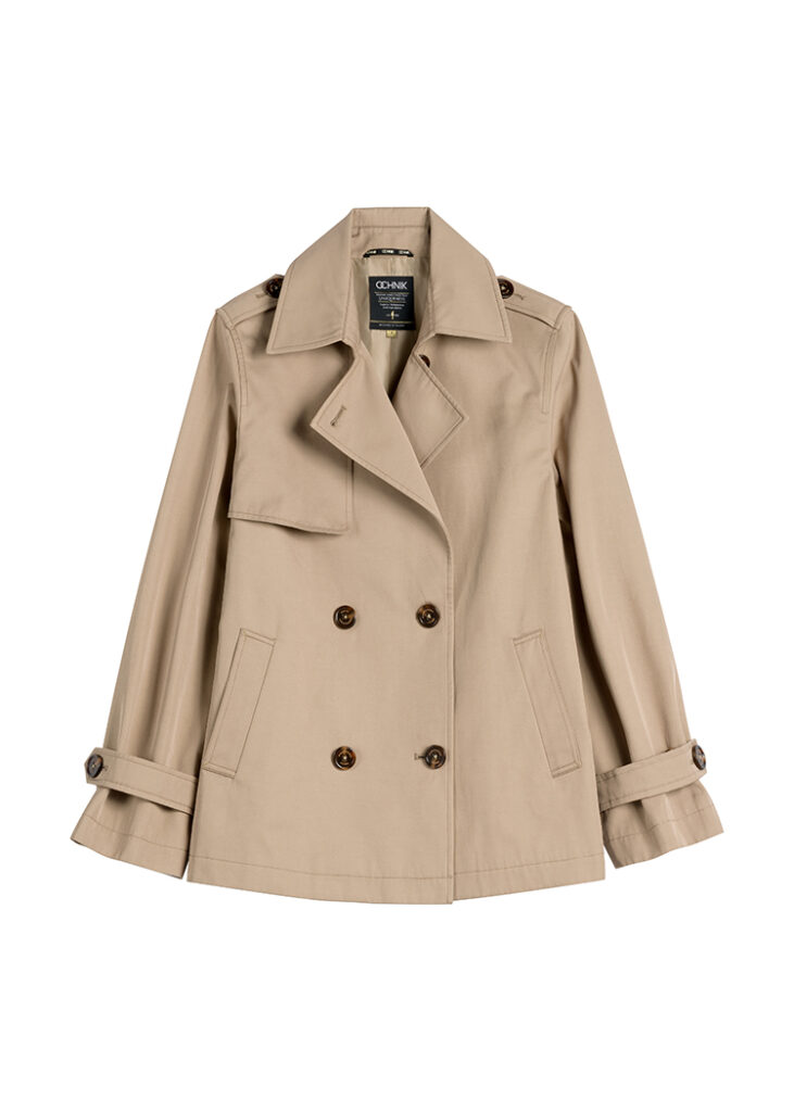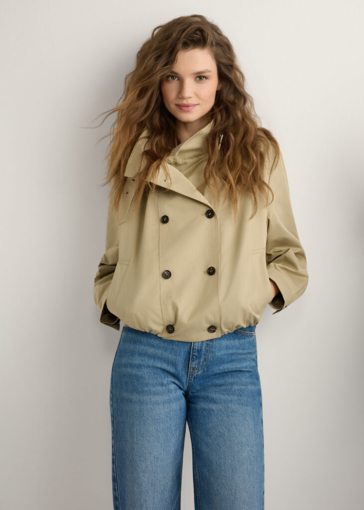Krótki trencz o oversizowym fasonie, kończący się maksymalnie na linii bioder, wygląda nowocześnie i oryginalnie. Co prawda nie jest tak elegancki, ale za to świetnie sprawdza się w miejskich i casualowych stylizacjach. Posiada dwurzędowe zapięcie, ale za to nie ma paska, który w tym przypadku jest zbędny. Zwłaszcza że taki płaszcz świetnie prezentuje się w rozpiętej wersji, tworząc asymetryczną linię, wyszczuplającą sylwetkę.