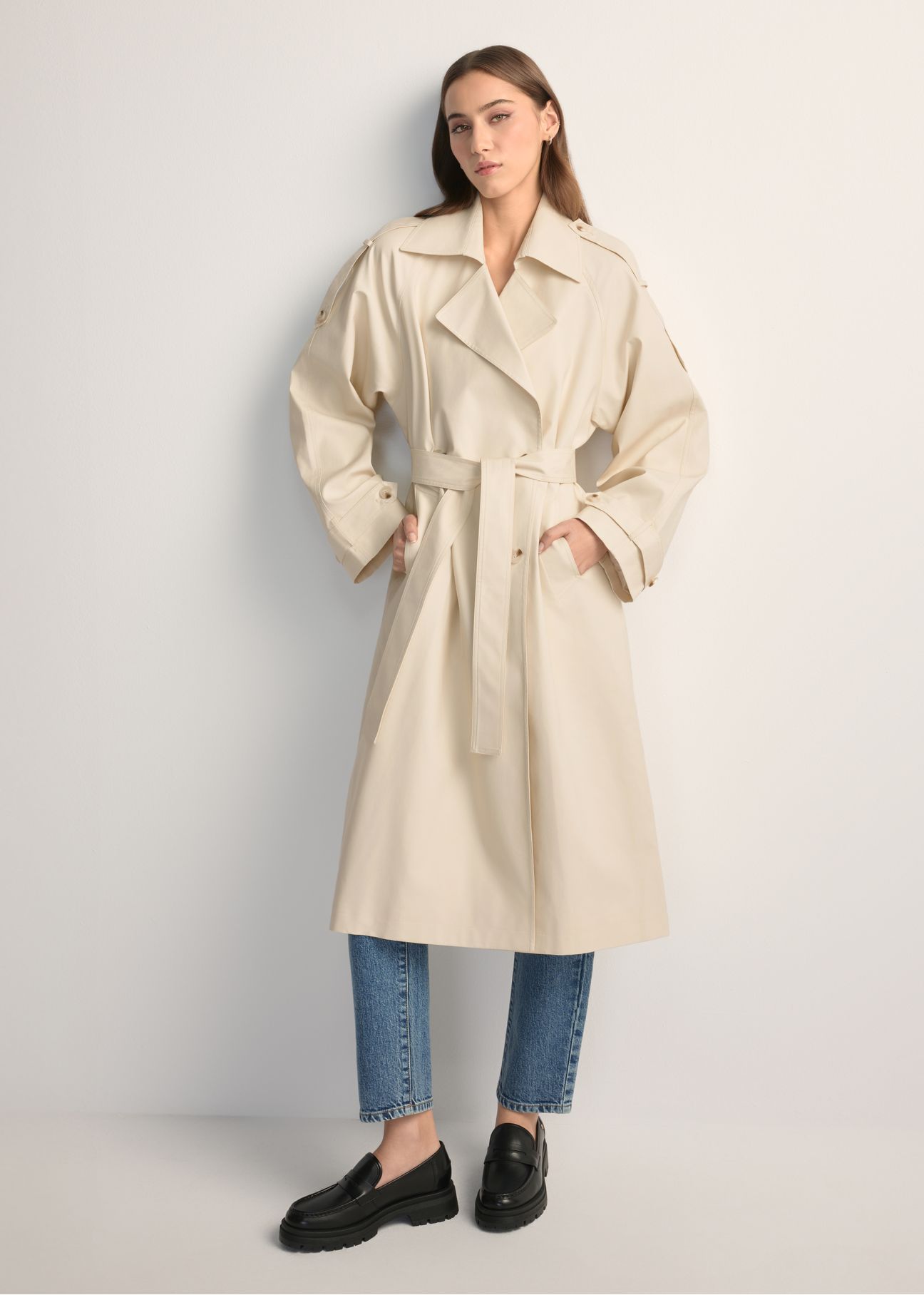 Modowym hitem sezonu wiosennego są obszerne, oversizowe płaszcze o przedłużonej linii ramion. Ich krój często posiada architektoniczną, przeskalowaną formę, co sprawia, że wyglądają nowocześnie, a są ponadczasowe. I wbrew pozorom wcale nie przytłaczają sylwetki ani nie poszerzają jej – to wszystko za sprawą paska, który zbiera materiał w talii, wysmuklając tę partię.
