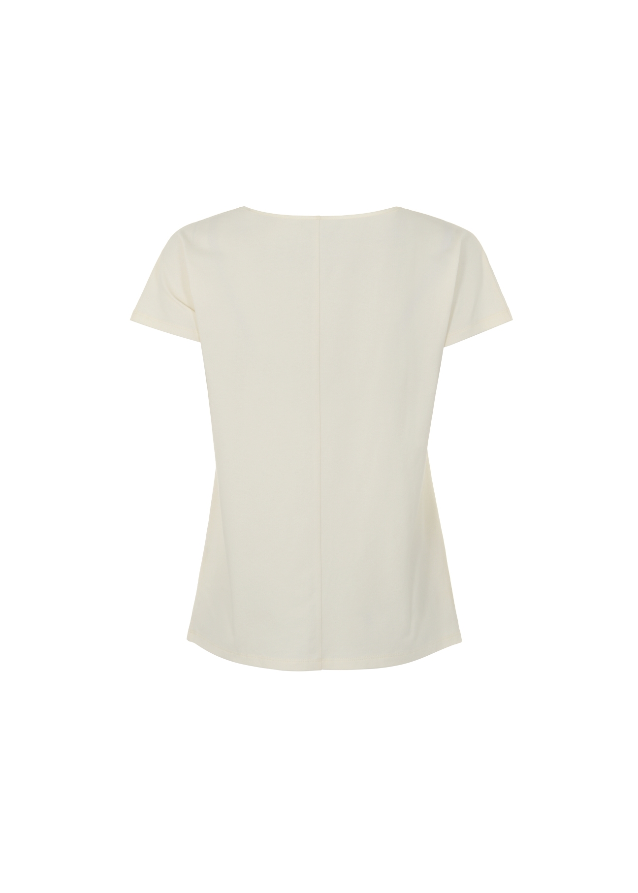 Bluzka damska w mlecznym kolorze z wykończeniem dekoltu w kolorze granatowym. Wykonana z bawełny z dodatkiem elastanu, co gwarantuje wygodę podczas noszenia. Elegancka, a zarazem wygodna propozycja pozwalająca na wiele stylizacji.