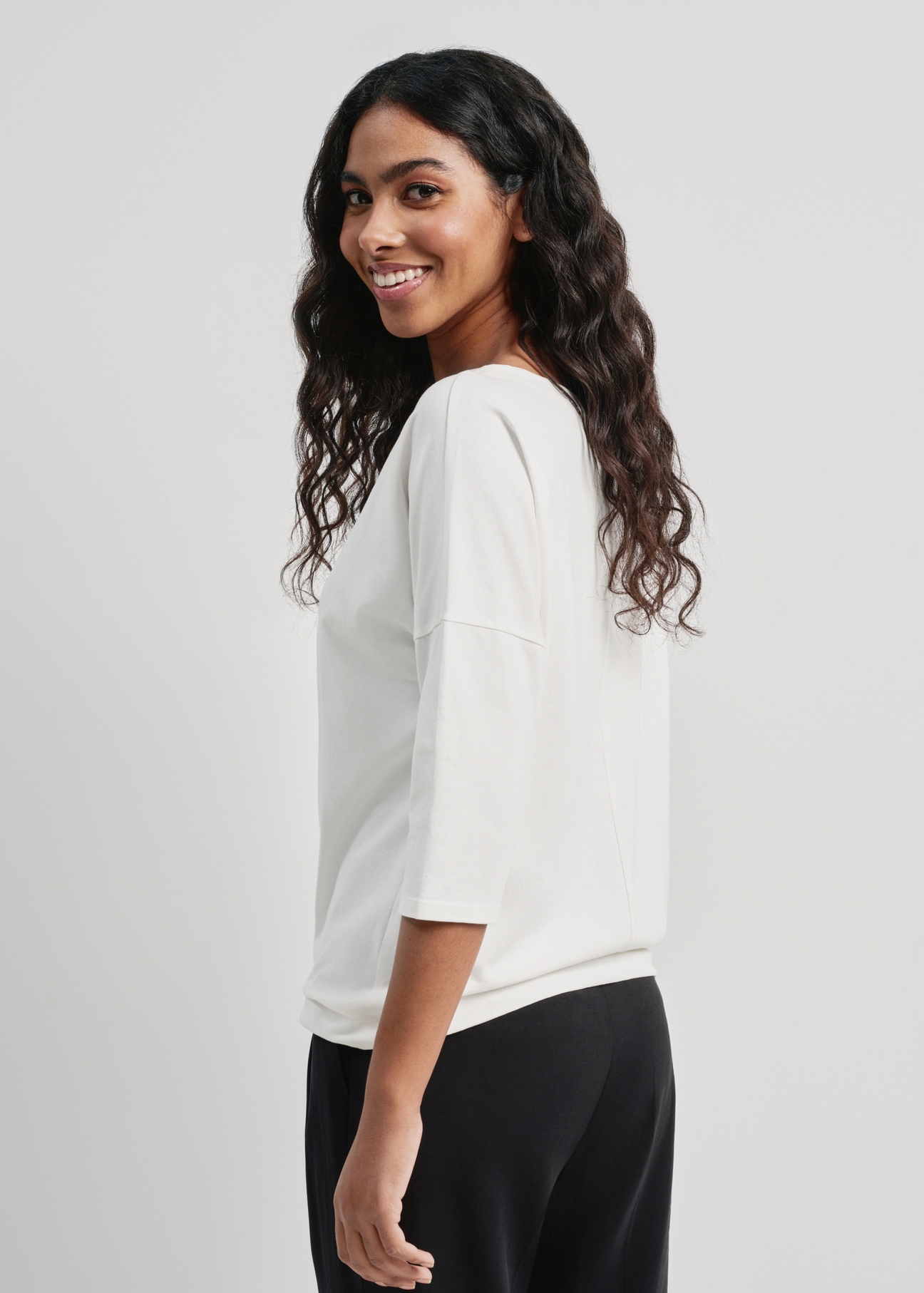 Bluzka damska wykonana z bawełny z dodatkiem elastycznych włókien. Zdobiona kwiecistym printem. Model z okrągłym dekoltem i rękawem do łokcia. Na dole troczki umożliwiające ściąnięcie bluzki.