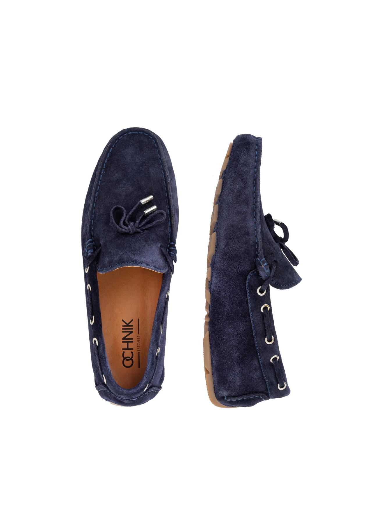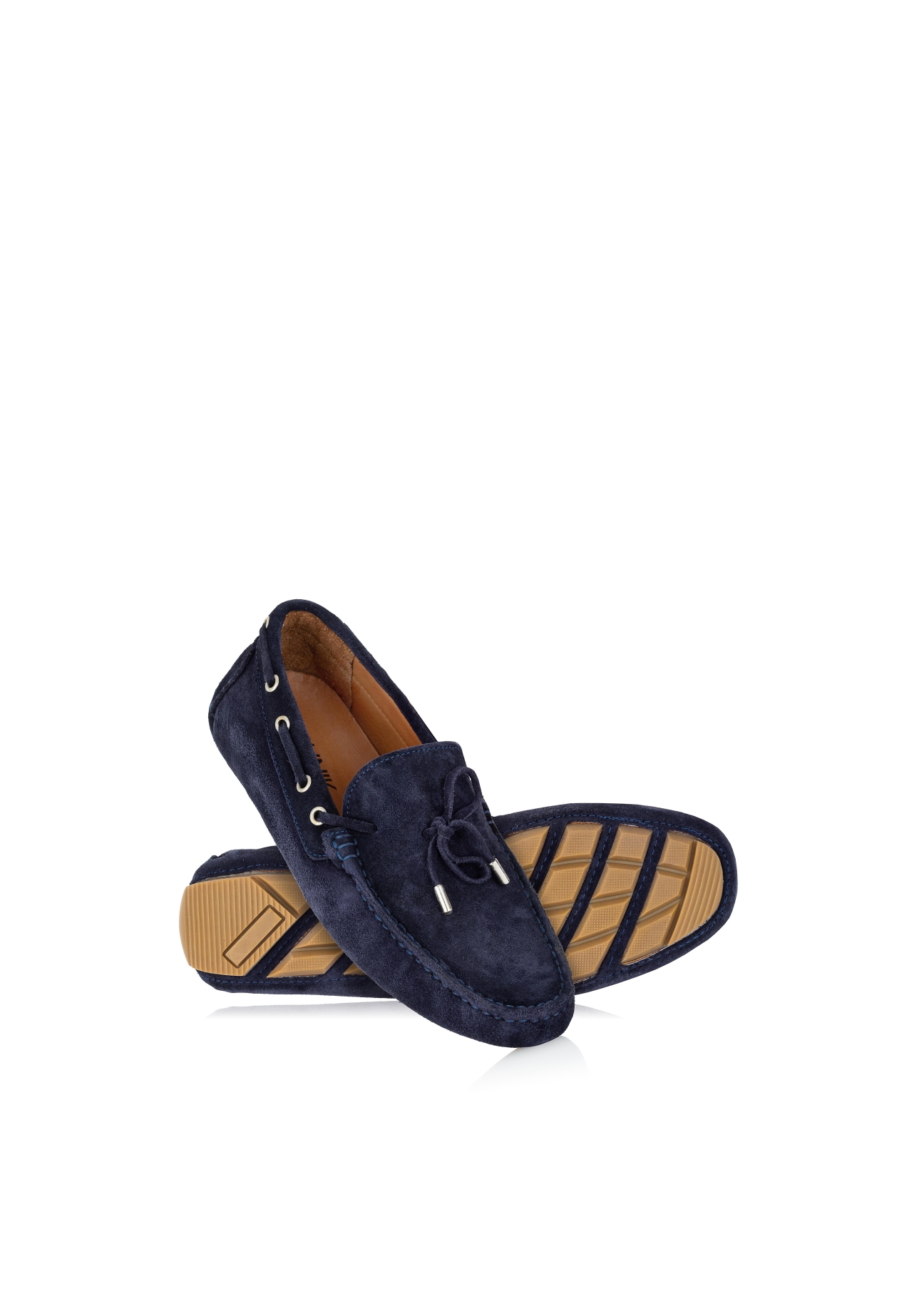 Eleganckie buty męskie tzw. mokasyny w granatowym kolorze. Wykonane z wysokogatunkowej naturalnej skóry zamszowej. Podeszwa zaś z gumy charakteryzującej się wygodą i wytrzymałością na ścieranie i warunki atmosferyczne. Buty tego typu będą idealnym uzupełnieniem casualowych stylizacji.