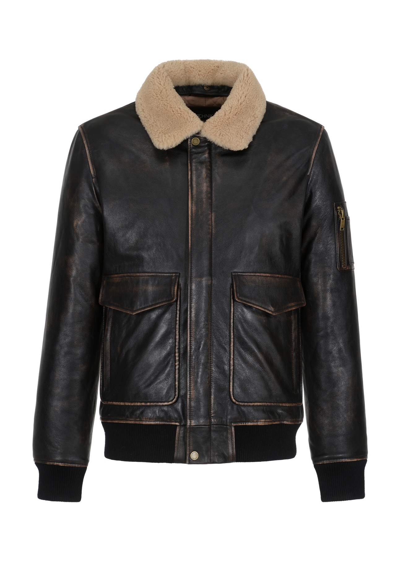 Męska kurtka wykonana ze skóry naturalnej bydlęcej w ciemnobrązowym kolorze. Model zapinany na suwak. Posiada dwie kieszenie zewnętrzne osłonięte klapą zamykane na zatrzaski, a na nich kieszenie otwarte. Wewnątrz jedna kieszeń zamykana na rzep. Kurtka z odpinanym kołnierzem ze skóry naturalnej owczej z okrywą włosową.