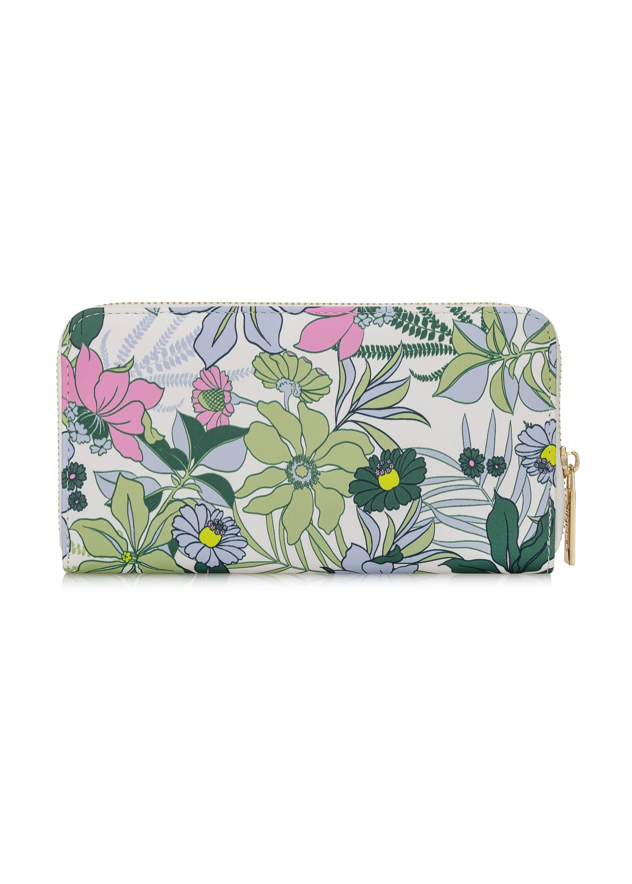 Portfel damski wykonany z matowionej imitacji skóry, zdobiony kwiecistym wzorem CLEMATIS. Zamykany suwakiem. Wewnątrz trzy przegrody, kieszeń na bilon zamykana na suwak, 8 miejsc na karty płatnicze lub dokumenty, dwie dodatkowe kieszenie.