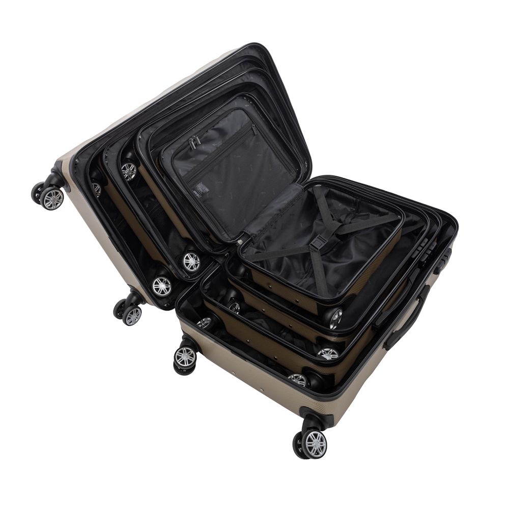 Komplet walizek wykonany z wytrzymałego i ekologicznego materiału PC w kolorze granatowym. Walizki posiadają podwójne kółka, wykonane z mieszanki kauczuku i gumy, łożyskowane, obrót 360 stopni. Wewnątrz walizek komora podzielona na dwie części, w jednej przestrzeń zamykana materiałem na suwak, w drugiej – elastycznymi pasami zabezpieczającymi. Na komplet walizek składają się walizki w rozmiarach: 16’/19’/24’/28’.