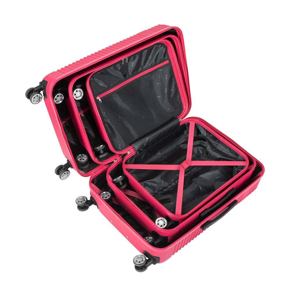 Komplet walizek wykonany z bardzo lekkiego, wytrzymałego i odpornego na uszkodzenia materiału ABS. Kółka podwójne, wykonane z mieszanki kauczuku i gumy, łożyskowane, obrót 360 stopni. Wewnątrz walizek komora podzielona na dwie części, w jednej przestrzeń zamykana materiałem na suwak, w drugiej – elastycznymi pasami zabezpieczającymi.