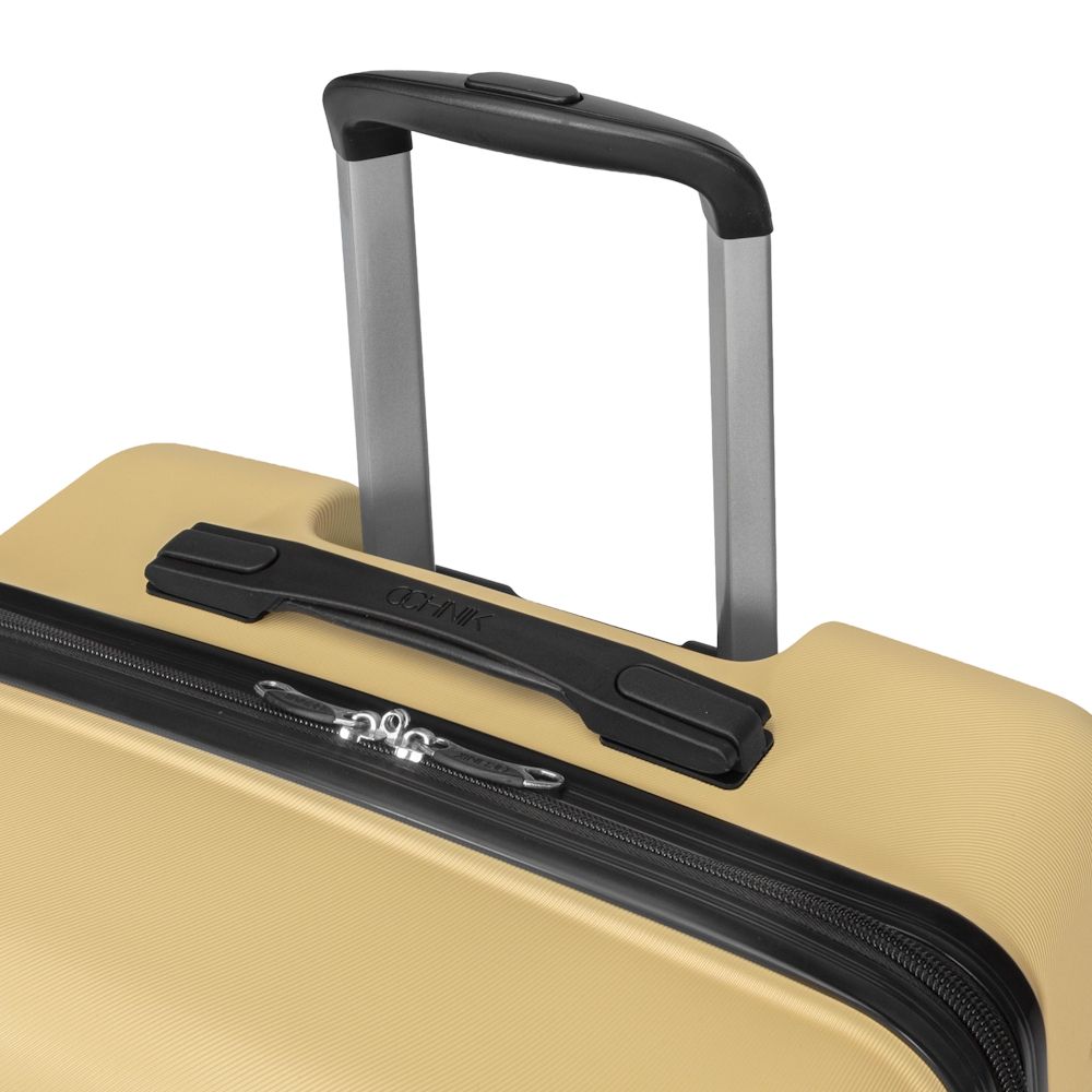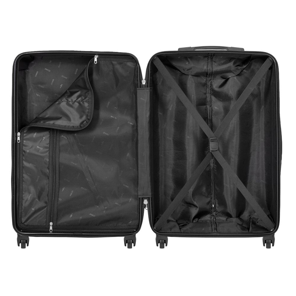 Komplet walizek wykonany z bardzo lekkiego, wytrzymałego i odpornego na uszkodzenia materiału ABS. Kółka pojedyncze, wykonane z mieszanki kauczuku i gumy, łożyskowane, obrót 360 stopni. Wewnątrz walizek komora podzielona na dwie części, w jednej przestrzeń zamykana materiałem na suwak, w drugiej – elastycznymi pasami zabezpieczającymi.