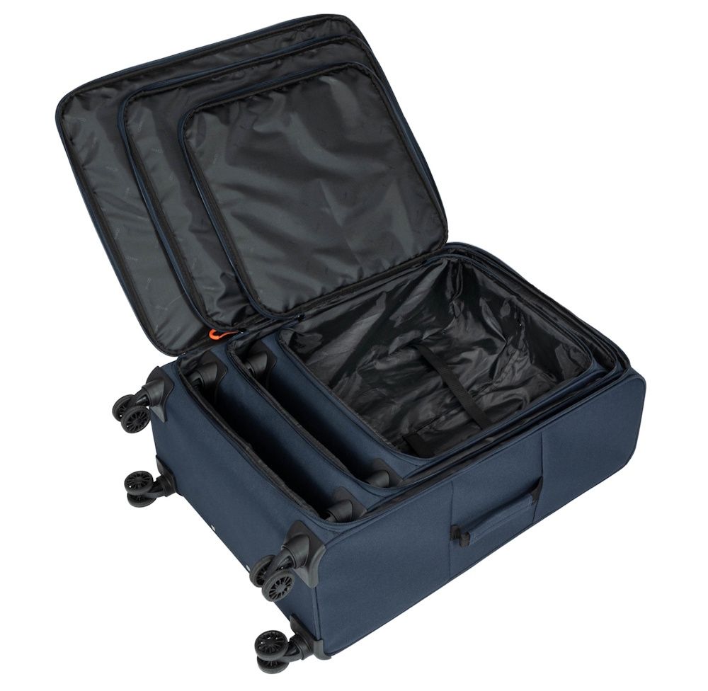 Komplet walizek wykonany z nylonu. Kółka podwójne, łożyskowane. Wewnątrz każdej z walizek znajduje się przestrzeń na odzież zamykana pasami zabezpieczającymi. Na zewnątrz, z przodu duża kieszeń na suwak oraz mała kieszeń na suwak. Na komplet walizek składają się walizki w rozmiarach: 19’/24’/28’.