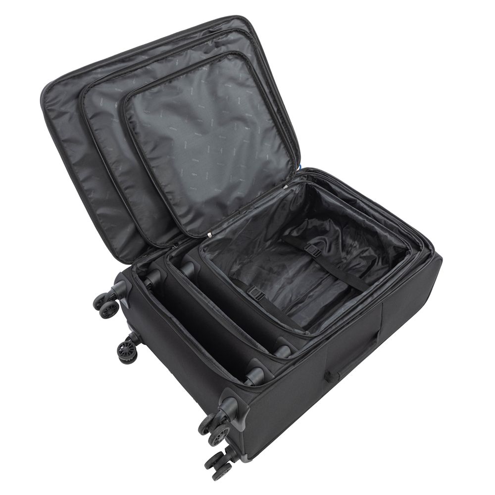 Komplet walizek wykonany z nylonu. Kółka podwójne, łożyskowane. Wewnątrz każdej z walizek znajduje się przestrzeń na odzież zamykana pasami zabezpieczającymi. Na zewnątrz, z przodu duża kieszeń na suwak oraz mała kieszeń na suwak. Na komplet walizek składają się walizki w rozmiarach: 19’/24’/28’.