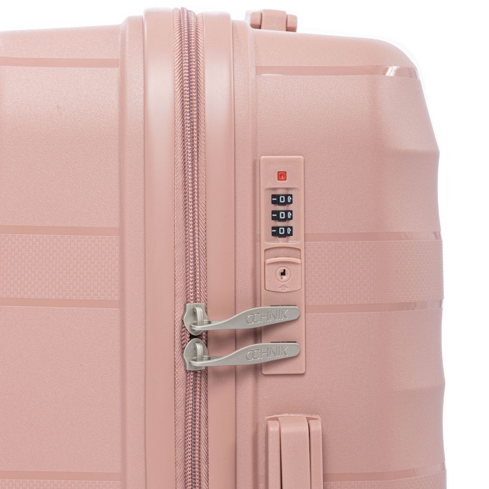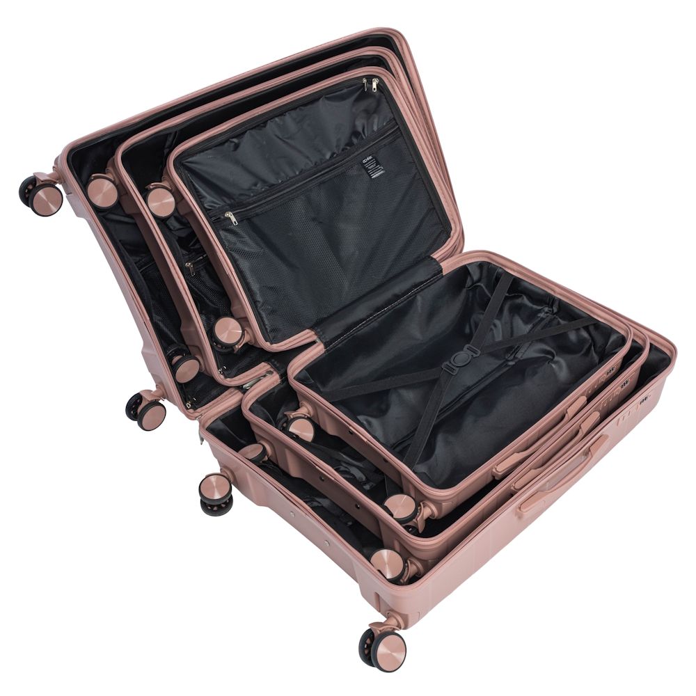 Komplet walizek wykonanych z elastycznego i odpornego na zarysowania materiału PP (polipropylenu). Model posiada zamek numeryczny. Walizki wyposażone w podwójne kółka o zakresie obrotu 360°. Dzięki dwóm gumowym rączkom oraz wysuwanemu uchwytowi możliwe jest ich wygodne transportowanie. Wewnątrz walizki podzielone na dwie komory. Jedna z części zamykana materiałem na suwak, posiada praktyczną kieszonkę z siatką, druga część z elastycznymi pasami zabezpieczającymi bagaż przed przemieszczeniem.Na komplet walizek składają się walizki w rozmiarach: 19’/24’/28’.