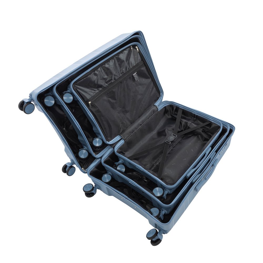 Komplet walizek wykonanych z elastycznego i odpornego na zarysowania materiału PP (polipropylenu). Model posiada zamek numeryczny. Walizki wyposażone w podwójne kółka o zakresie obrotu 360°. Dzięki dwóm gumowym rączkom oraz wysuwanemu uchwytowi możliwe jest ich wygodne transportowanie. Wewnątrz walizki podzielone na dwie komory. Jedna z części zamykana materiałem na suwak, posiada praktyczną kieszonkę z siatką, druga część z elastycznymi pasami zabezpieczającymi bagaż przed przemieszczeniem.Na komplet walizek składają się walizki w rozmiarach: 19’/24’/28’.