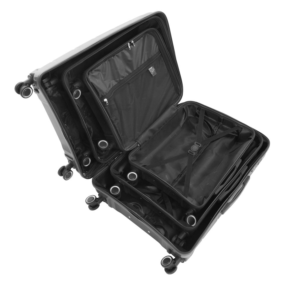 Komplet walizek wykonanych z elastycznego i odpornego na zarysowania materiału PP (polipropylenu). Model posiada zamek numeryczny. Walizki wyposażone w podwójne kółka o zakresie obrotu 360°. Dzięki dwóm gumowym rączkom oraz wysuwanemu uchwytowi możliwe jest ich wygodne transportowanie. Wewnątrz walizki podzielone na dwie komory. Jedna z części zamykana materiałem na suwak, posiada praktyczną kieszonkę z siatką, druga część z elastycznymi pasami zabezpieczającymi bagaż przed przemieszczeniem.Na komplet walizek składają się walizki w rozmiarach: 19’/24’/28’.