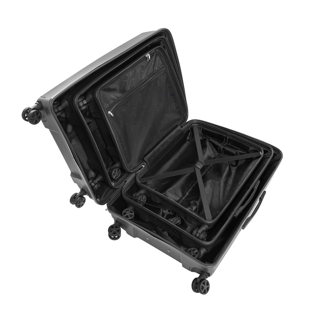 Komplet walizek wykonanych z elastycznego i odpornego na zarysowania materiału PP (polipropylenu). Model posiada zamek szyfrowy TSA. Walizki wyposażone w podwójne kółka o zakresie obrotu 360°. Dzięki dwóm gumowym rączkom oraz wysuwanemu uchwytowi możliwe jest ich wygodne transportowanie. Wewnątrz walizki podzielone na dwie komory. Jedna z części zamykana materiałem na suwak, posiada praktyczną kieszonkę z siatką, druga część z elastycznymi pasami zabezpieczającymi bagaż przed przemieszczeniem.Na komplet walizek składają się walizki w rozmiarach: 19’/24’/28’.