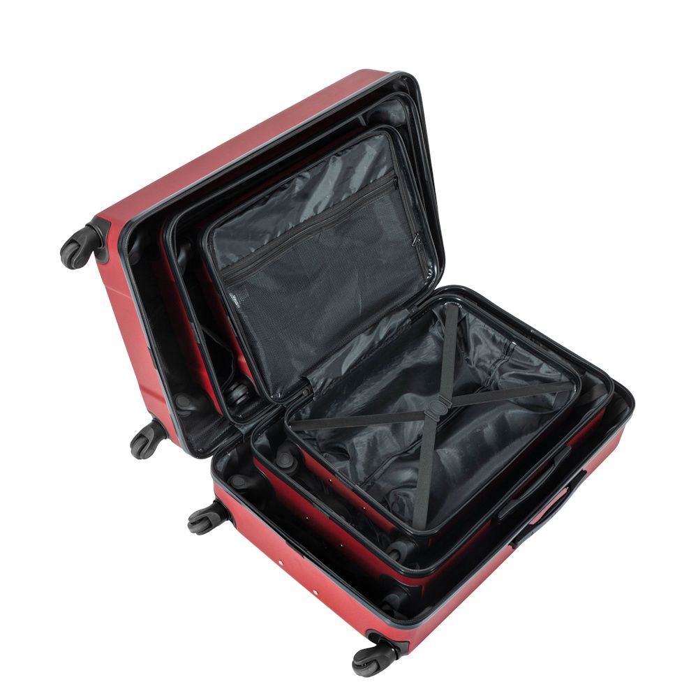 Komplet twardych walizek wykonany z bardzo lekkiego, wytrzymałego i odpornego na uszkodzenia materiału ABS. Walizki jednokomorowe, zamykane na dwustronnie odsuwany suwak. Wewnątrz walizek komora podzielona na dwie części, w jednej przestrzeń zamykana materiałem na suwak, w drugiej elastycznymi pasami zabezpieczającymi. Każda walizka posiada dodatkowo funkcjonalną kieszeń siateczkową. Kółka pojedyncze, wykonane z mieszanki kauczuku i gumy, łożyskowane, obrót 360 stopni.
