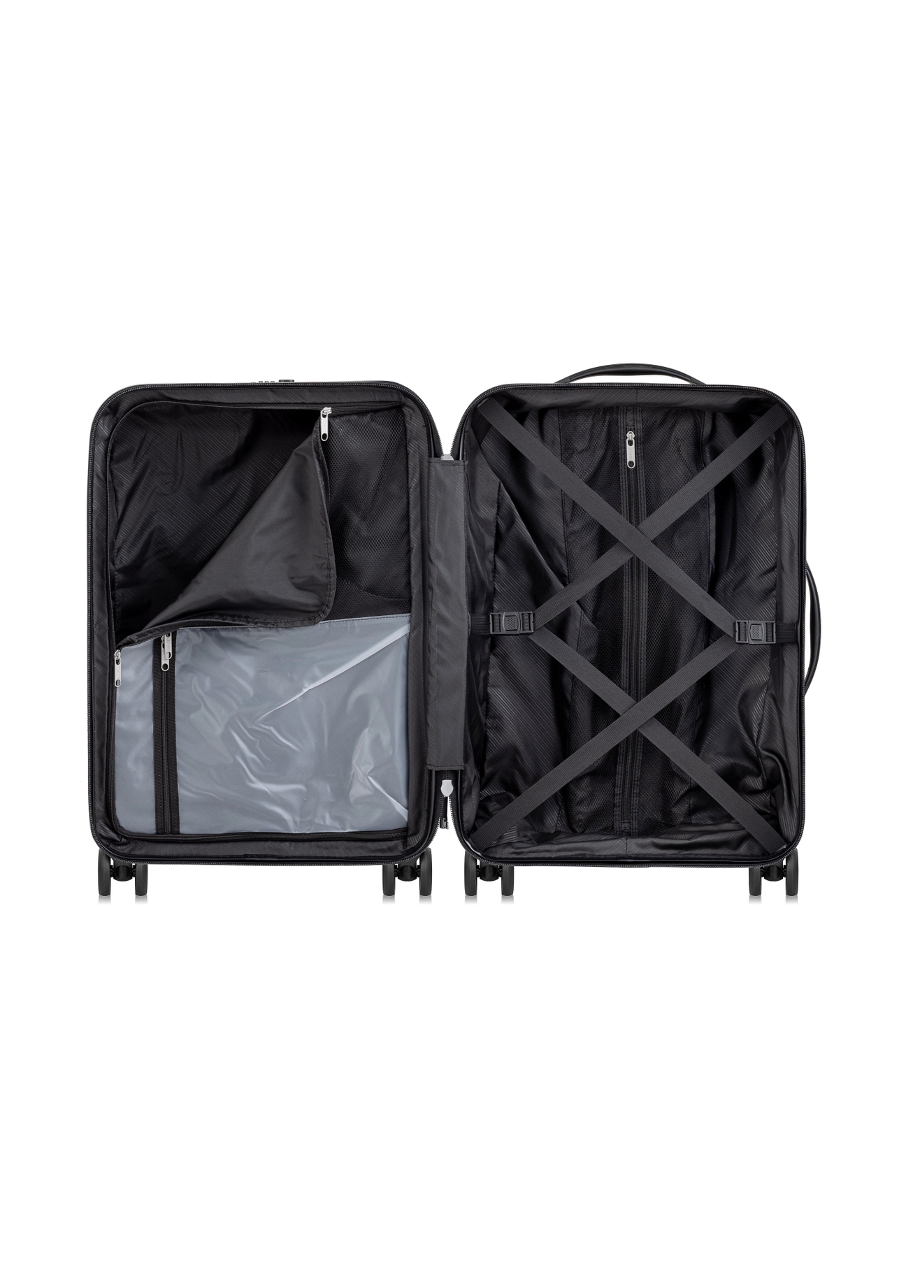 Komplet walizek wykonany z bardzo wytrzymałego materiału PC w kolorze czarnym. Walizki posiadają podwójne kółka, wykonane z mieszanki kauczuku i gumy, łożyskowane, obrót 360 stopni. Wewnątrz walizek jest komora podzielona na dwie części, w jednej przestrzeń zamykana materiałem na suwak, w drugiej – elastycznymi pasami zabezpieczającymi. Dla jak najbezpieczniejszej podróży, walizki są zaopatrzone w zintegrowany zamek TSA. Na komplet walizek składają się walizki w rozmiarach: 20’/24’/28’.