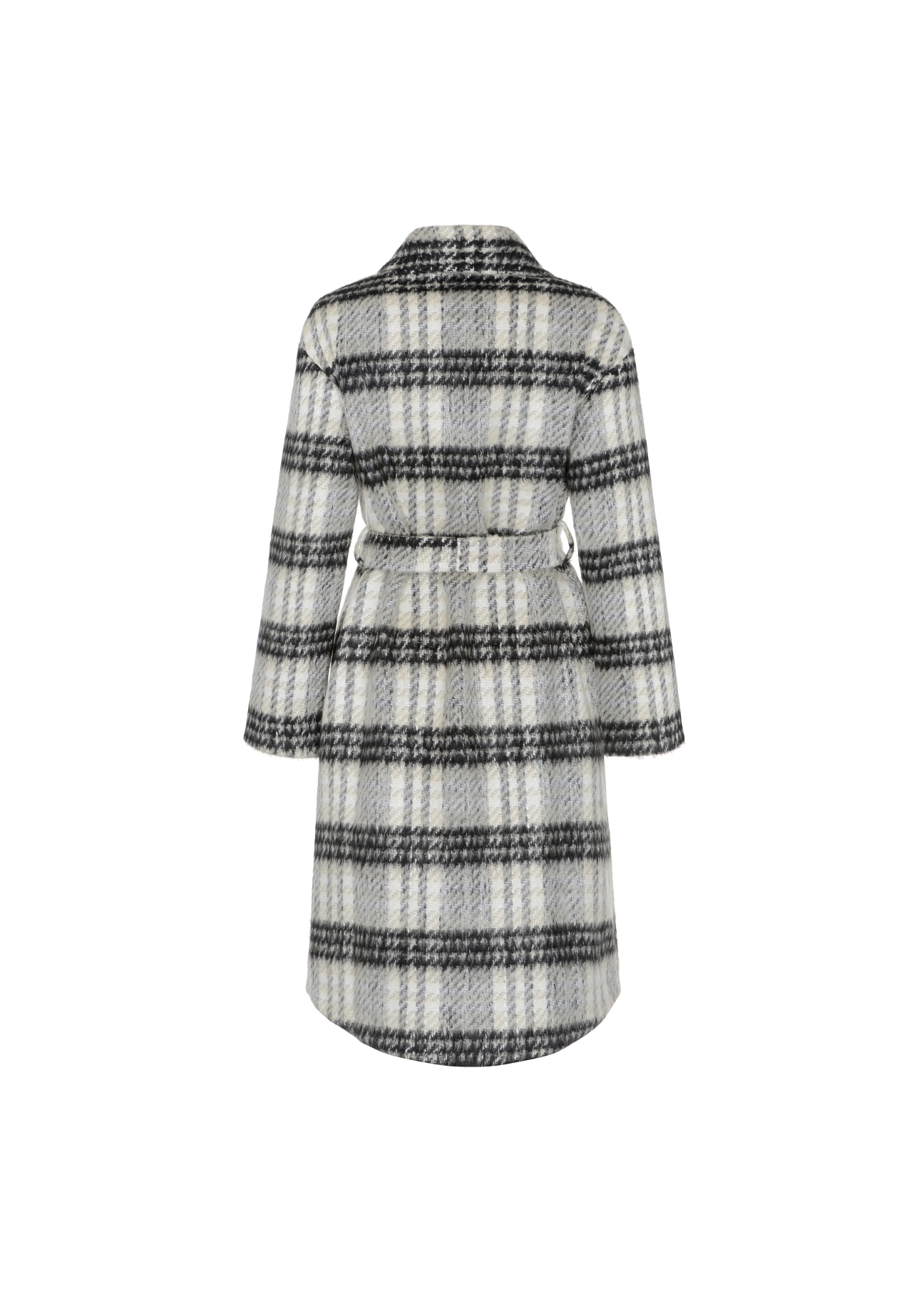 Płaszcz damski w kratę, w odcieniach czerni, beżu i bieli. Model wykonany jest w stylu koszuli z małym kołnierzykiem i naszywanymi kieszeniami. Doskonała propozycja dla kobiet stawiających na modne stylizacje.