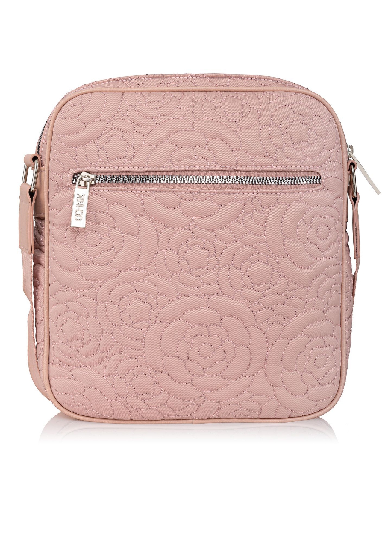Torebka damska w różowym kolorze. Wykonana z nylonu. Model posiada fakturę z kwiatowym zdobieniem. Torebka ma regulowany pasek umożliwiający noszenie na ramieniu.