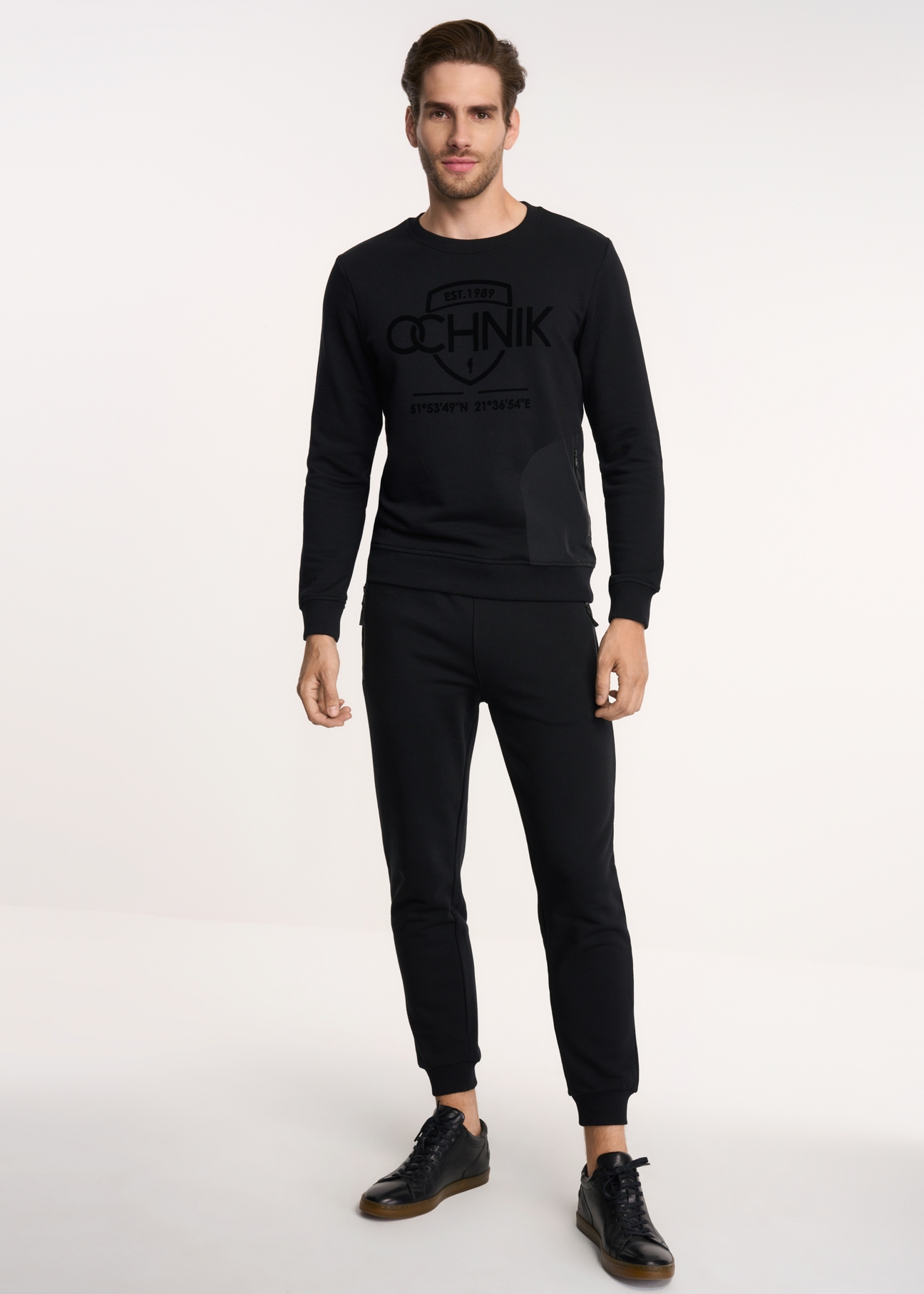 Spodnie męskie w kolorze czarnym. Wykonane z połączenia tkanin: bawełny z poliestrem. Spodnie w pasie mają gumę oraz umożliwiające regulację troczki. Model wyposażony został w praktyczne kieszenie zamykane na suwak.