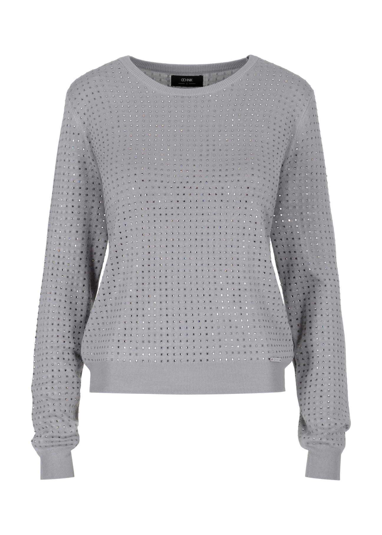 Sweter wykonany z przewiewnej tkaniny. Na całej powierzchni zdobiony kwadratowymi dżetami w kolorze szarym. Dolny rant oraz mankiety zakończone ściągaczami.