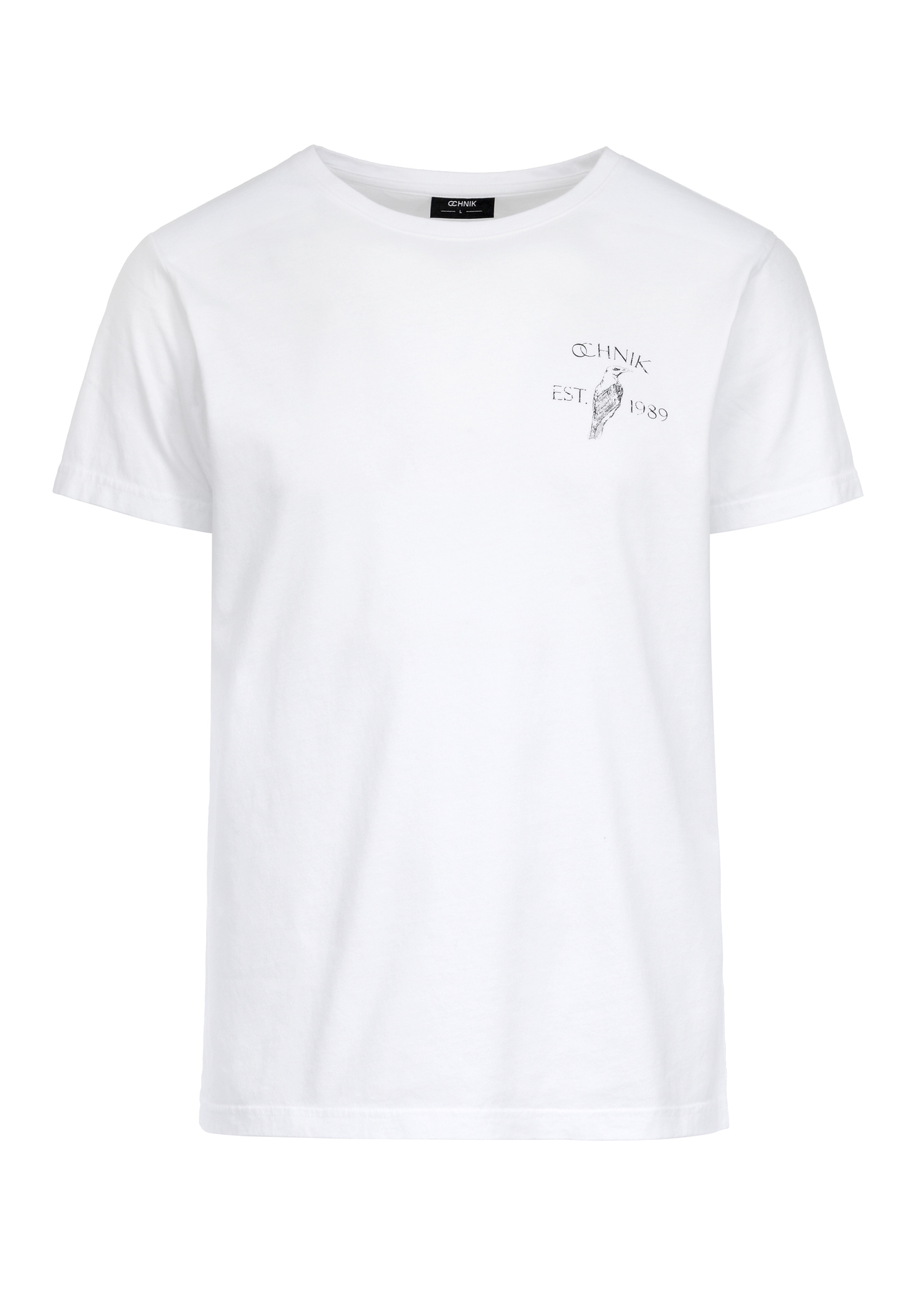 T-shirt męski wykonany z przyjemnej w dotyku bawełny, która dobrze przepuszcza powietrze. Białą, ponadczasową kolorystykę przełamuje niewielki nadruk z logo marki.