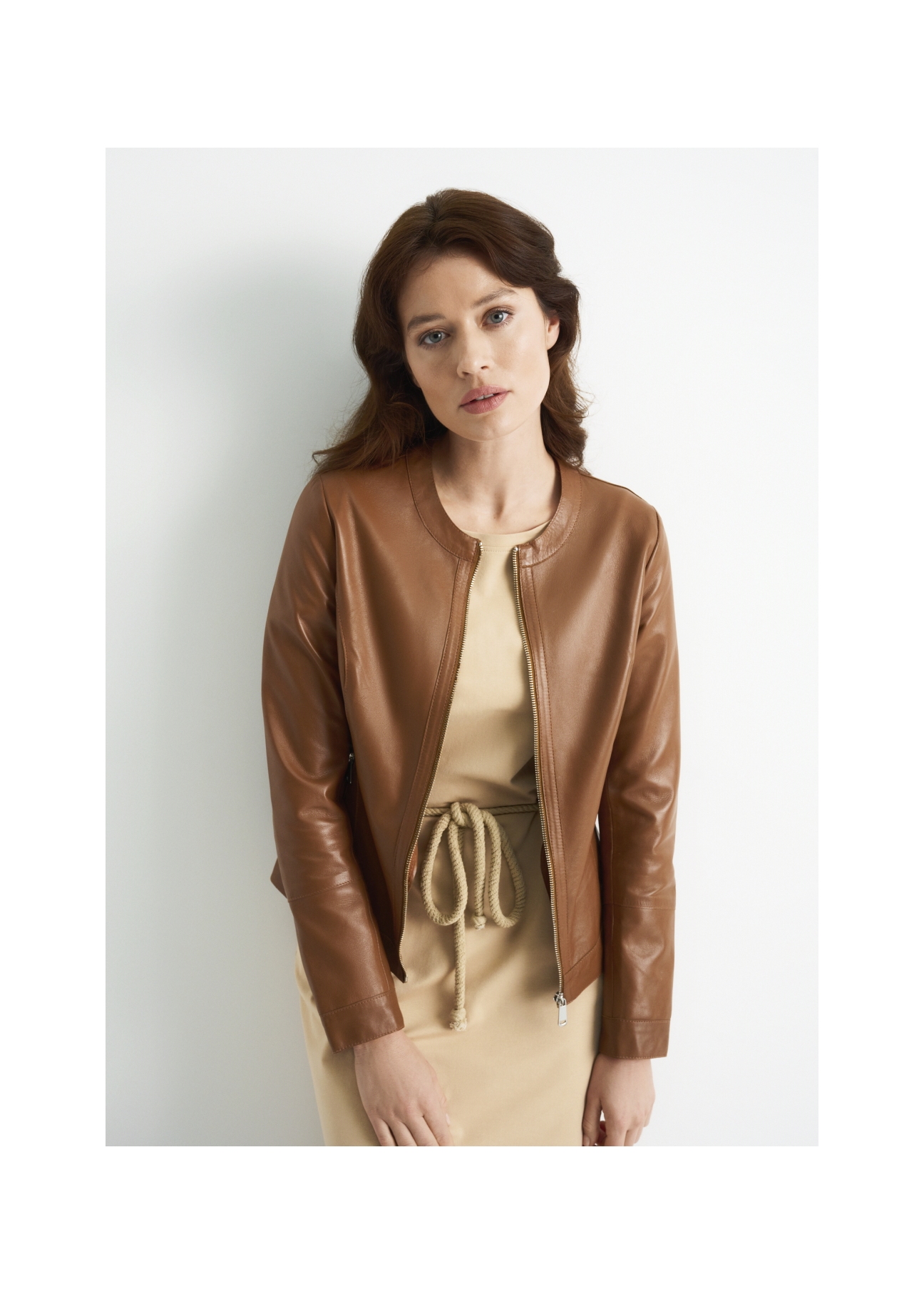 Kurtka damska w kolorze koniakowym. Wykonana z wysokogatunkowej naturalnej skóry owczej typu Nappa. Prosta, uniwersalna forma gwarantuje ponadczasowość modelu, dzięki niej model daje się łatwo zestawiać z innymi elementami garderoby. Model wykonany ze skóry specjalnie wykończonej, co pozwoliło na zrezygnowanie z części podszewkowej.