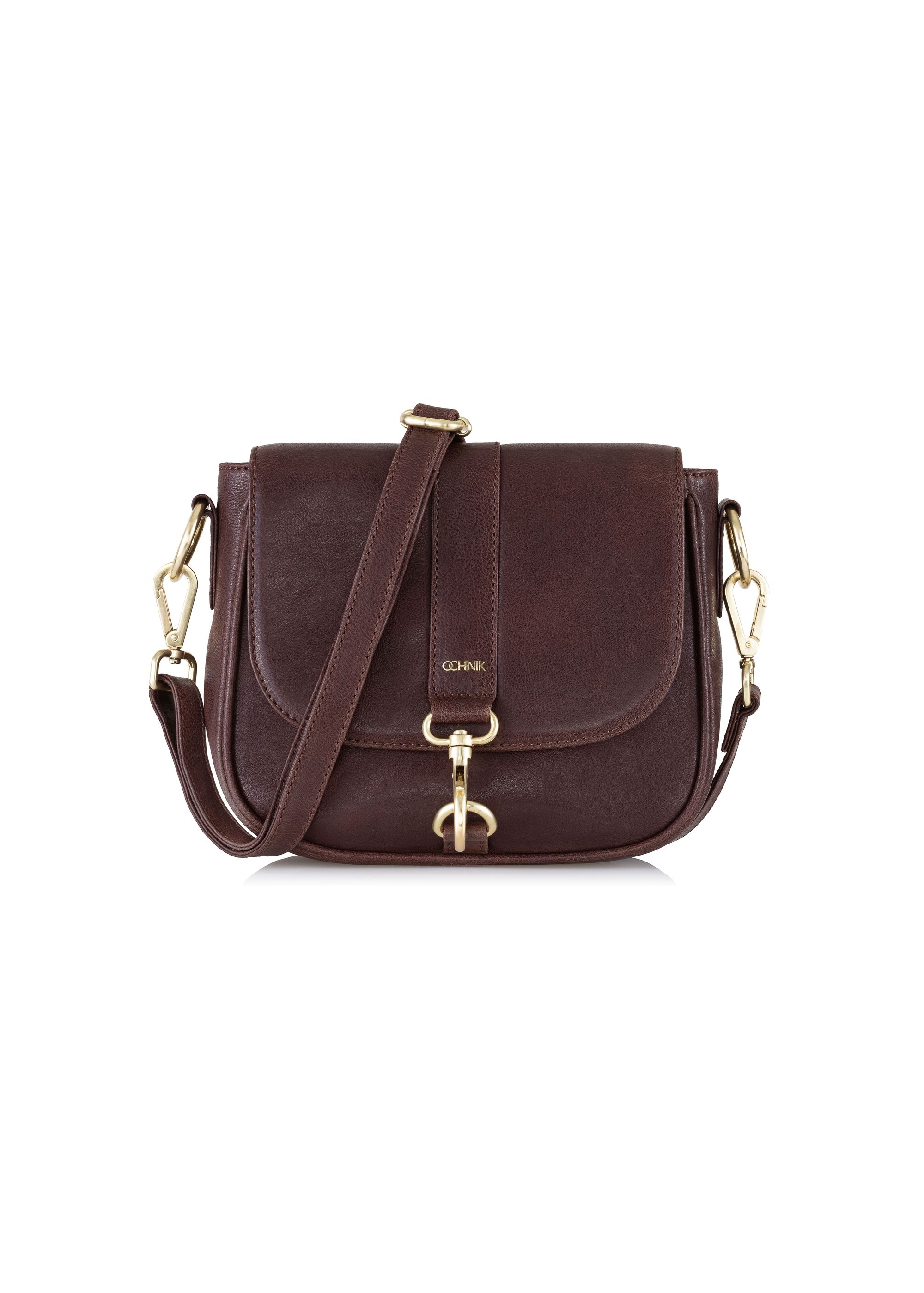 Wykonana z naturalnej skóry torebka typu saddle bag. Zabezpieczona klapą z zapięciem na karabińczyk w kolorze postarzanego złota, który nadaje styl vintage. Wewnątrz kieszenie – dwie otwarte i jedna zamykana na suwak, całość wykończona ciemną podszewką we wzór graficznego symbolu marki OCHNIK – wilgi.