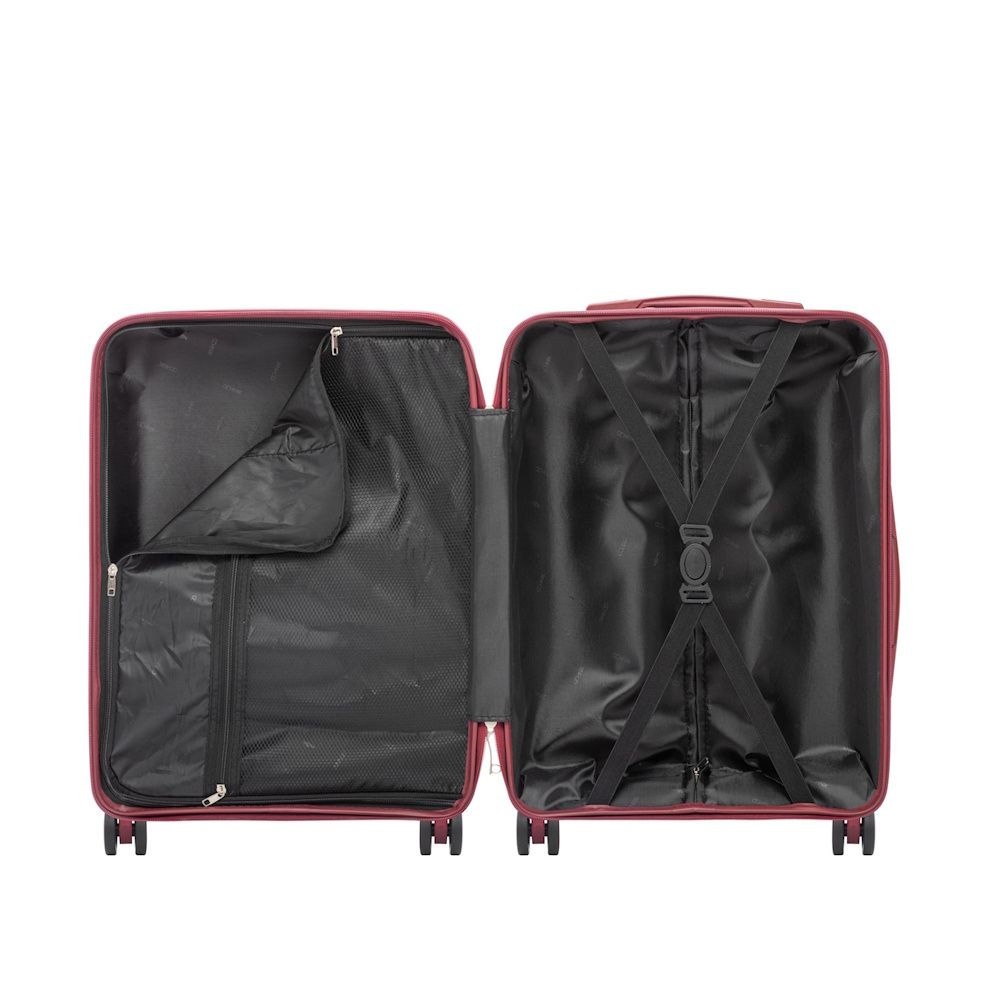 Duża walizka wykonana z elastycznego i odpornego na zarysowania materiału PP (polipropylenu). Model posiada zamek numeryczny. Walizka wyposażona w podwójne kółka o zakresie obrotu 360°. Dzięki dwóm gumowym rączkom oraz wysuwanemu uchwytowi możliwe jest jej wygodne transportowanie. Wewnątrz walizka podzielona na dwie komory. Jedna z części zamykana materiałem na suwak, posiada praktyczną kieszonkę z siatką, druga część z elastycznymi pasami zabezpieczającymi bagaż przed przemieszczeniem.