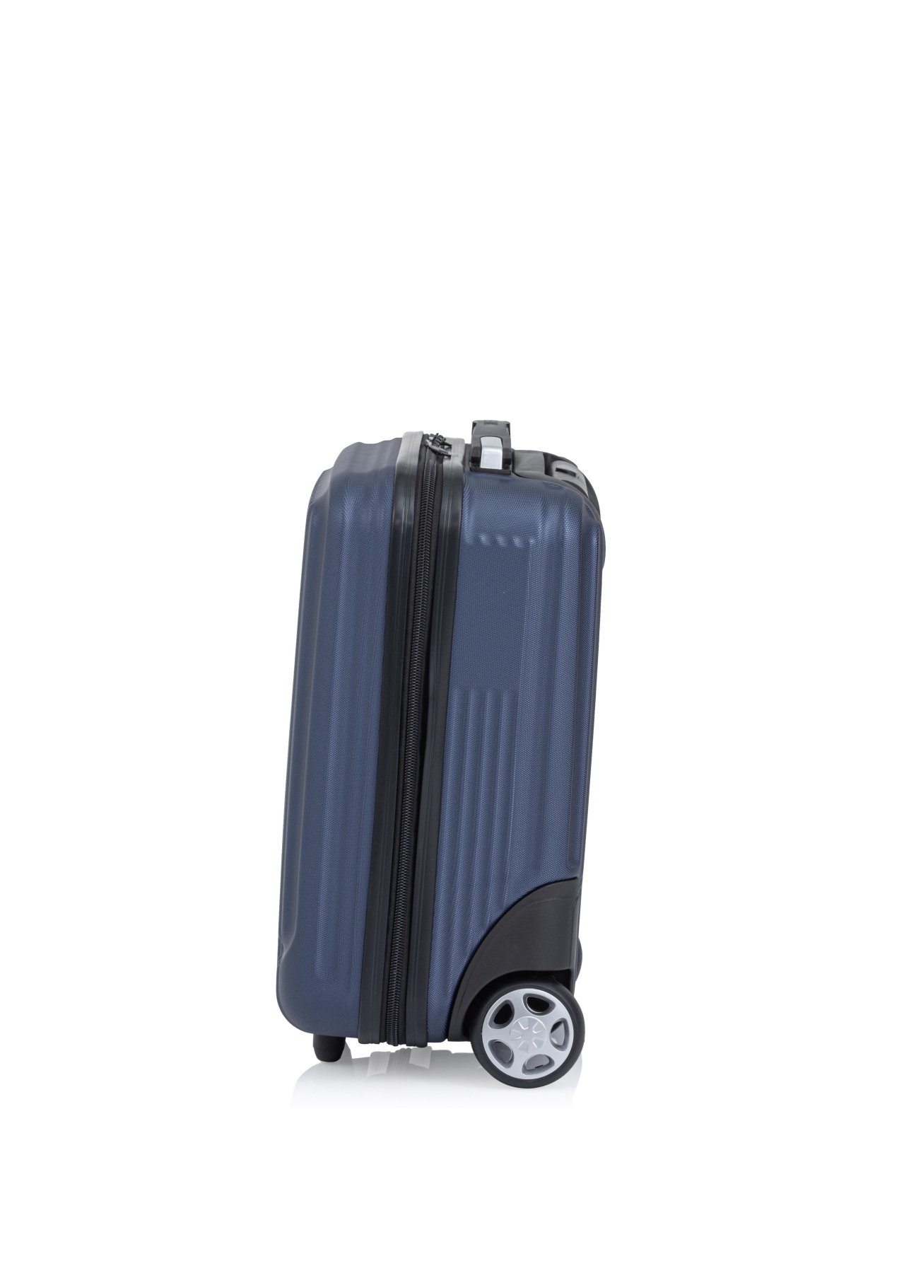 Mała walizka o opływowym kształcie w kolorze granatowym. Wykonana z bardzo lekkiego, wytrzymałego i odpornego na uszkodzenia materiału ABS. Kółka pojedyncze, wykonane z mieszanki kauczuku + gumy, łożyskowane. Wewnątrz komora podzielona na dwie części, w jednej przestrzeń zamykana materiałem na suwak, w drugiej – elastycznymi pasami zabezpieczającymi. Świetnie sprawdzi się jako bagaż podręczny do linii lotniczych: Ryanair, Air France, American Airlines, LOT, Norwegian, Wizzair, Easy Jet, Qatar Airways, Emirates, Lufthansa.